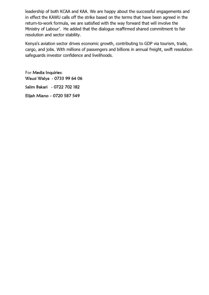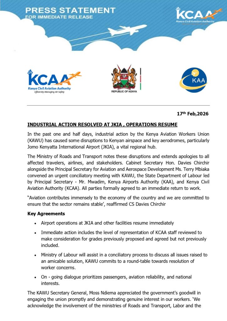 Following an urgent conciliation meeting involving the Ministry of Roads and Transport, the Ministry of Labour, KCAA, and the Kenya Airports Authority (KAA), all parties agreed to an immediate return-to-work formula. The government issued an apology to passengers and airlines for the disruption, and confirmed that a structured dialogue process will continue, led by the Ministry of Labour, to address outstanding worker concerns.